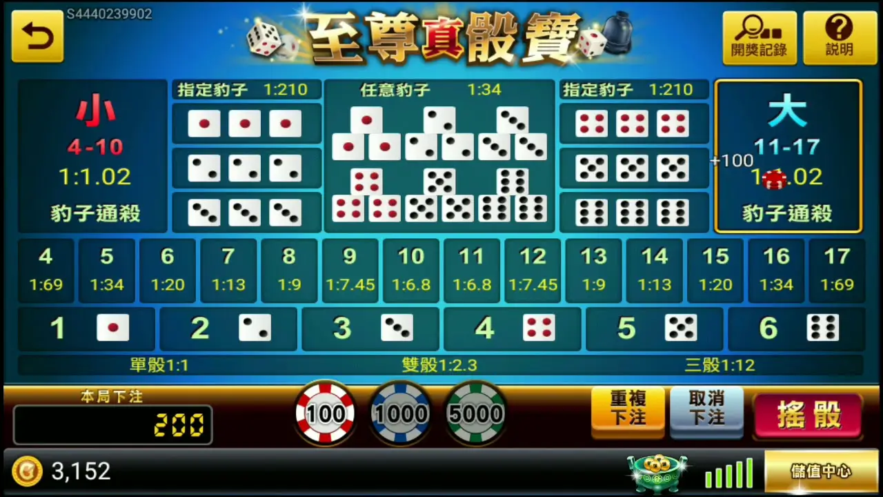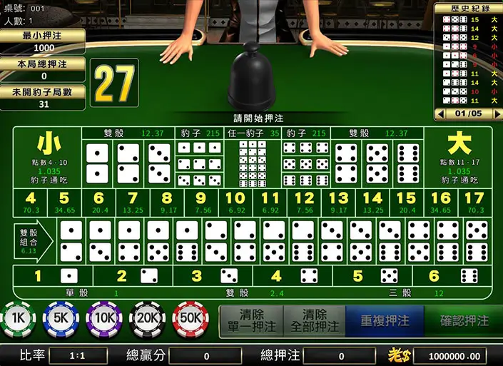预测三颗骰子总点数为大(11–17)或小(4–10)。规则简单、命中稳定,是新手最常选择的方式。
