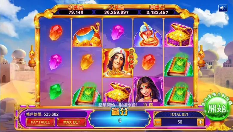 在视觉表现方面,阿拉丁神灯采用浓厚的异域风格。背景多以夜色中的沙漠宫殿、穹顶与星空为主,整体色彩偏向金色、深蓝与宝石色调,营造出神秘而华丽的观感。